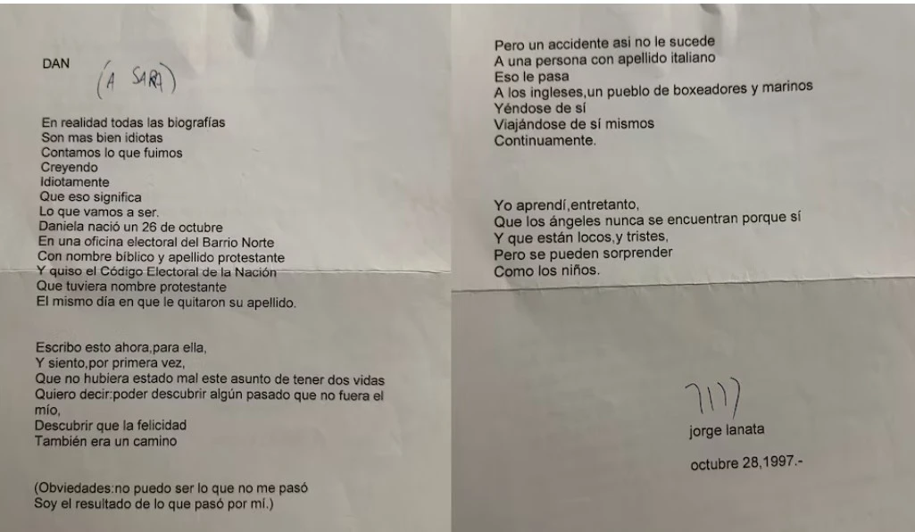 “Esto me lo escribió cuando finalmente encontré a Mercedes, mi mamá biológica (él me había ayudado en esa misión)”, publicó Sara, evidenciando la especial conexión que compartían con Jorge más allá de los aspectos visibles de su relación, como su matrimonio y la hija en común. “No puedo creer que no se lo mostré cuando, una vida después, supimos que él también era adoptado”.