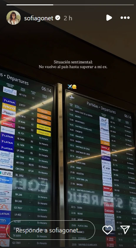 Luego de días de rumores y tras la certeza de que Homero y La Reini ya no se seguían en Instagram, Sofía tiró el bombazo en la mañana del lunes 14 de julio al publicar una foto en sus historias desde el Aeropuerto de Ezeiza con la siguiente leyenda: “Situación sentimental: no vuelvo al país hasta superar a mi ex”. A lo que luego él respondió con un mensaje camino a OLGA: "Tas para el corchazo".