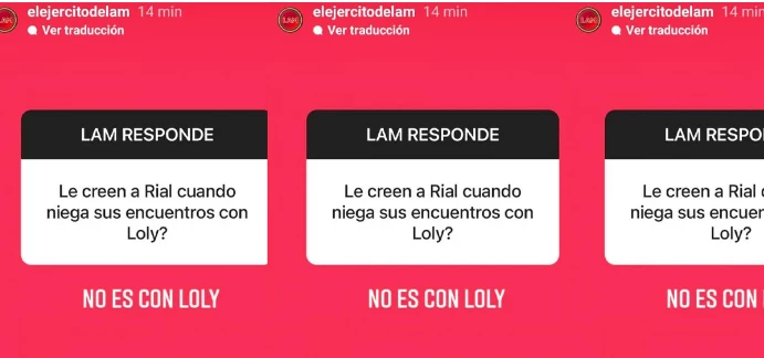 Pero nada tuvo que ver Mariana Antoniale -ex pareja de Rial que está instalada hace años en Miami-, que fue nuevamente vinculada al nombre de Jorge. El mismo IG asegura que en la vida de Rial hay otra mujer que no es la Niña Loly. "¿Le crees a Rial cuando niega sus encuentros con Loly?", compartió la red social, como pregunta disparador de respuesta.