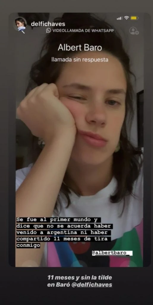 Pero el tierno gesto de Albert no le bastó a Delfina quien realizó un segundo reclamo, esta vez, con el apoyo de sus seguidores quienes destacaron la divertida y mala actitud del actor. Y es que en la imagen se puede ver como Baró prefirió dejar su cara en tamaño más grande y minimizar a su compañera mientras charlaban.