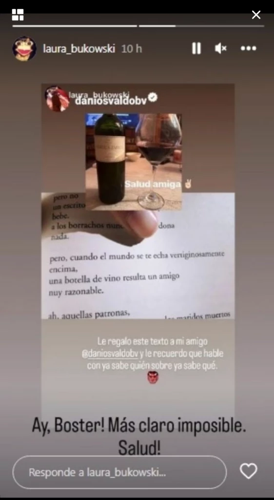 La storie la publicó esta mujer que luce muy compinche con Osvaldo y reza una frase llamativa: "Le regalo este texto a mi amigo Daniel y le recuerdo que hable con ya sabe quién sobre ya sabe qué". Además de incluir un parafraseo de un libro.