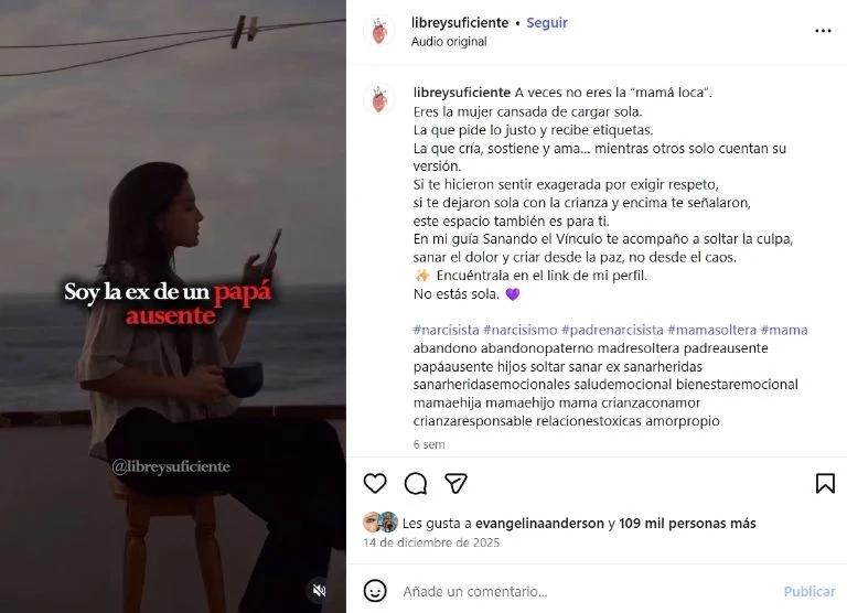 El posteo en cuestión pertenece a la cuenta @libreysuficiente y está dirigido a mujeres que atraviesan la maternidad en soledad tras una separación. En el texto, se habla de madres que cargan solas con la crianza, que son tildadas de “mamás locas” y cuyos reclamos suelen ser minimizados o tratados como exagerados.