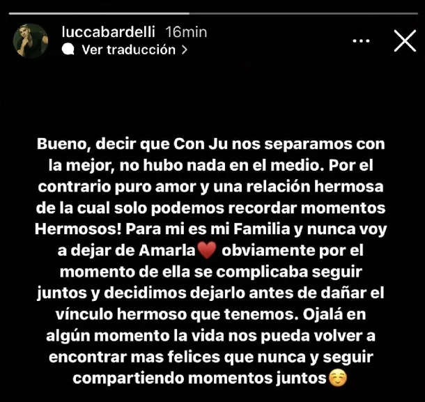 LUCCA BARDELLI LE DEDICÓ UNAS PALABRAS A JULIETA TRAS LA RUPTURA