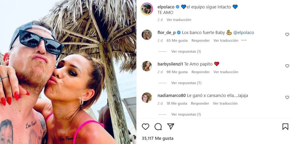 "El equipo sigue intacto, te amo", expresó el rubio en su posteo, al lado de una postal playera donde se los ve muy juntos. De inmediato, Barby se hizo eco de la publicación y le comentó: “Te amo, papito”. Incluso Flor Peña les hizo el aguante: “Los banco fuerte, baby”.