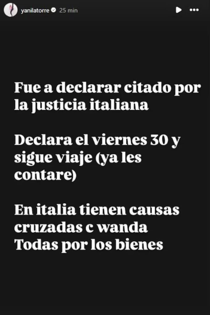“¿Quieren saber a qué fue Mauro a Milán? Fue a declarar, citado por la justicia italiana. Declara el viernes 30 y sigue viaje (ya les contaré). En Italia tienen causas cruzadas con Wanda por todos los bienes”, compartió Latorre quien interrumpe a diario sus vacaciones para contar lo que se va enterando.