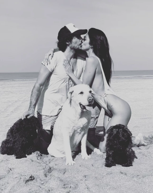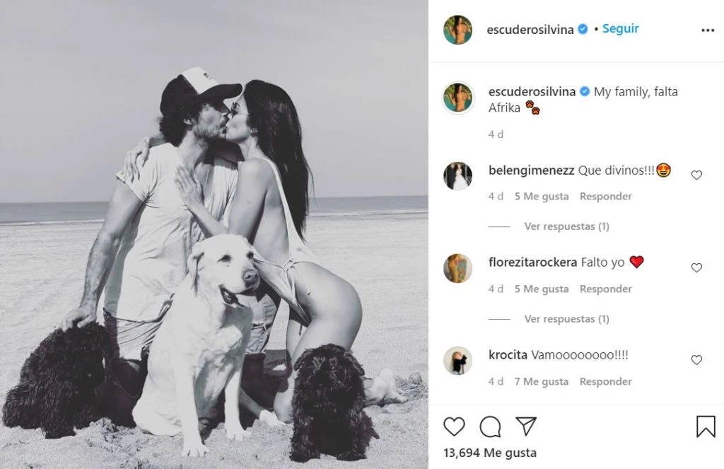 “My family (mi familia). Falta Afrika”, expresó Silvina en un posteo de su cuenta de Instagram, una foto en blanco y negro desde las playas de Cariló en donde se ve en primer plano un tremendo beso en la boca con el muchacho, y a tres de sus fieles compañeros: sus perritos.
