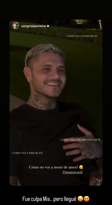 Derretida por la “serenata” de su novio, Sangre Japonesa compartió el clip y agregó, embelesada: “¿Cómo vas a sonreír así? ¿Cómo vas a tener esos ojos? ¿Cómo no voy a morir de amor?”. Y luego, al compartir la story, el jugador contestó con un guiño a la letra de la canción: “Fue culpa mía, pero llegué”.