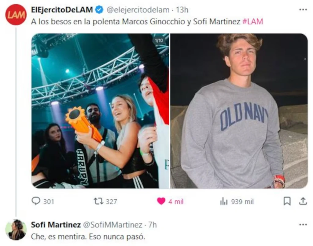 La periodista de Urbana Play respondió a una de las publicaciones de la cuenta de El Ejército de LAM. Con ánimos de detener esta bola de nieve, la ex novia de Diego Leuco aseguró que nunca tuvo nada con el Primo. “Che, es mentira. Eso nunca pasó”, lanzó la rubia, tajante.