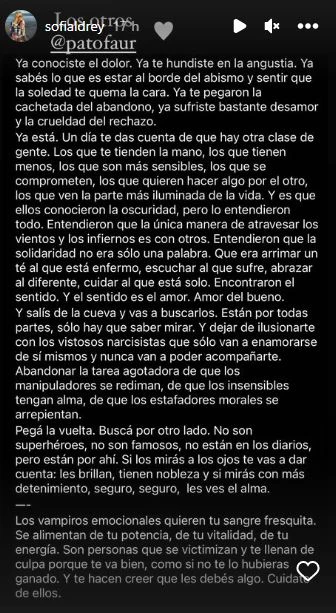 Y como hizo en otras oportunidades, la maquilladora marplatense optó por expresarse a través de la psicóloga Patricia Faur, de quien compartió un texto muy fuerte que alude directamente al hijo de Carmen Barbieri, sin necesidad de mencionarlo.