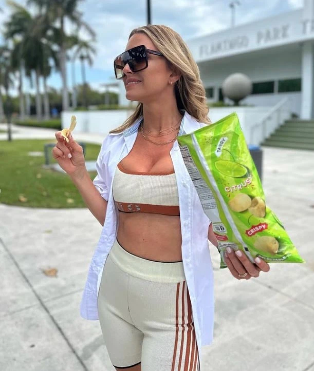 En otra de las postales, optó por un traje de baño coquette color rosado, con moldería triangulito y una bombacha que se unía con moños a los costados. La modelo posó en la pileta mientras se refrescaba y disfrutaba de un desayuno con frutas, wafles, café y jugo de naranja que flotaba en una canasta.