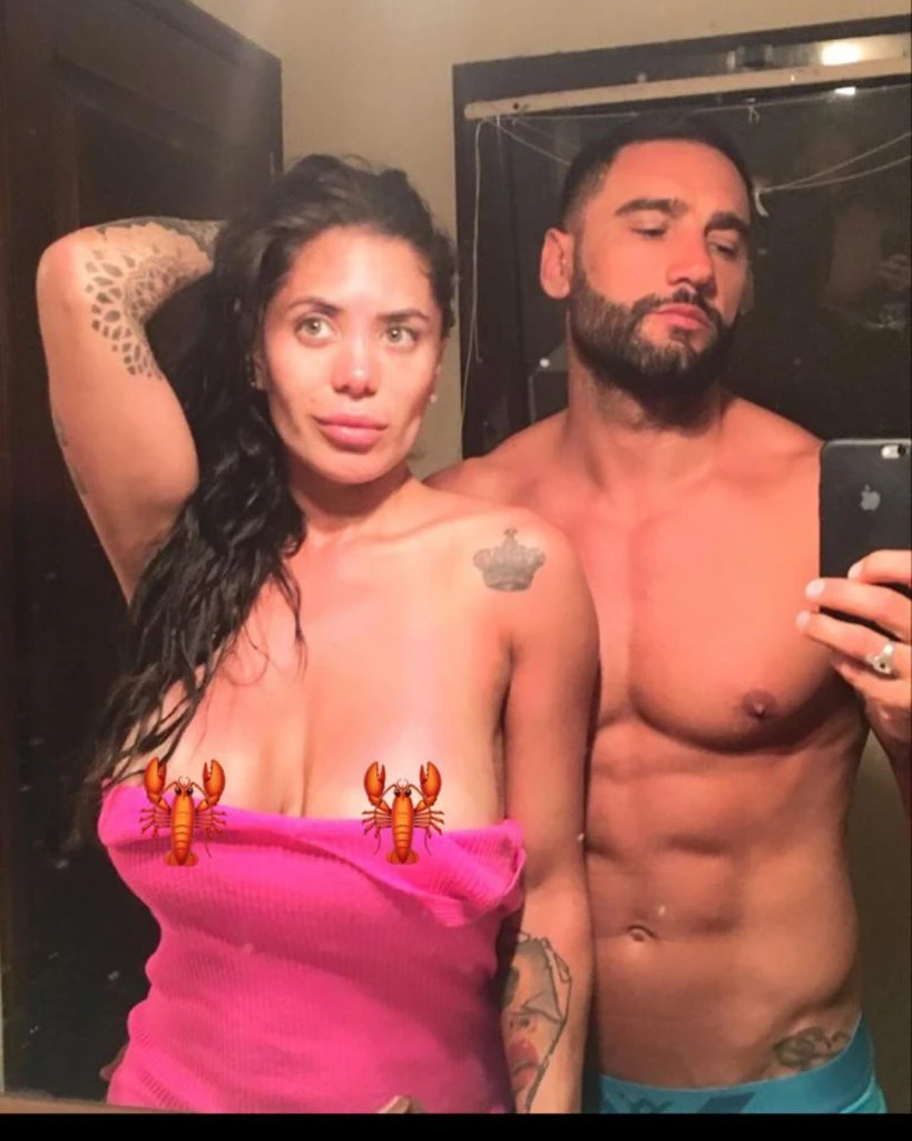 Y en esta oportunidad, compartió dos fotos frente al espejo, en donde Alejandro está sin remera con el pecho descubierto y ella con un vestidito que dejó caer los hombros y tapó sus pezones con emojis de langostas.
