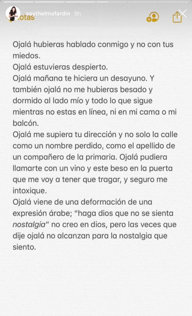 “Ojalá viene de una deformación de una expresión árabe; “haga Dios que no se sienta nostalgia”. No creo en Dios, pero las veces que dije ojalá no alcanzan para la nostalgia que siento”, concluyó en la primera imagen.