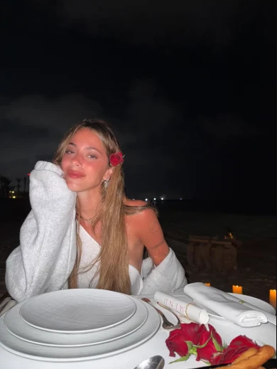 Horas más tarde llegó la ráfaga de fotos por parte de Tini. Cuatro postales muy claras: mesa para dos, corazón de velas, ramo de rosas rojas y la misma mano oculta en cada una de las imágenes. En una sostiene flores, en otra descansa bajo el mantel, en la tercera se pierde detrás del ramo, y en la última queda fuera de cuadro.