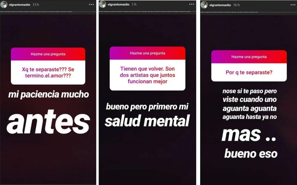 Como la pareja está casada desde mayo de 2018, otro de sus admiradores le preguntó si le iba a pedir el divorcio, a lo que Tomasito respondió con un contundente: “Sí”. También explicó su sensación de hartazgo frente a otra pregunta. “No sé si te pasó, pero viste cuando uno aguanta, aguanta, aguanta, hasta que ya no más”, explicó.