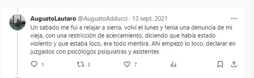 "Un sábado me fui a relajar a la sierra, volví el lunes y tenía una denuncia de mi vieja, con una restricción de acercamiento, diciendo que había estado violento y que estaba loco, era todo mentira", agregó el joven. "Ahí empezó lo loco, declarar en juzgados con psicólogos psiquiatras y asistentes sociales, teniendo que demostrar que no estaba loco...”, aseguró Augusto.
