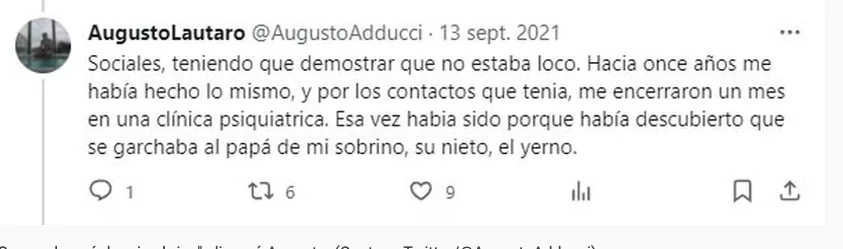 "Hacía once años me había hecho lo mismo y por los contactos que tenía, me encerraron un mes en una clínica psiquiátrica. Esa vez había sido porque había descubierto que se garchado al papá de mi sobrino, su nieto, el yerno”, confesó Augusto.