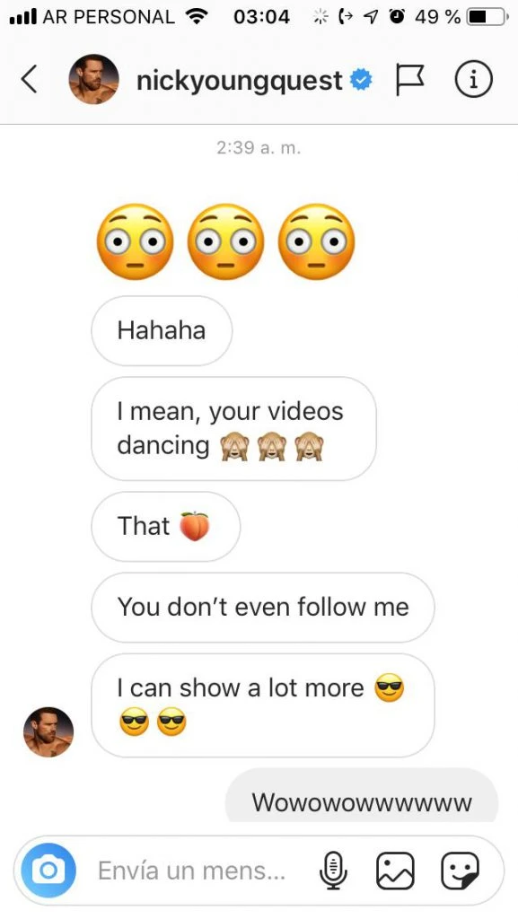 El hombre de 36 años, comenzó a seguirla en Instagram y luego le escribió por mensaje privado que “Le gustan los videos que sube bailando y no puede dejar de verlos” y “que le gustaría verla en la vida real”. Nick, le pidió a la rubia que le envié una foto de ella y la cantante le envió una foto sonriendo. El australiano fue por todo y respondió: “Puedo ser diablo”.