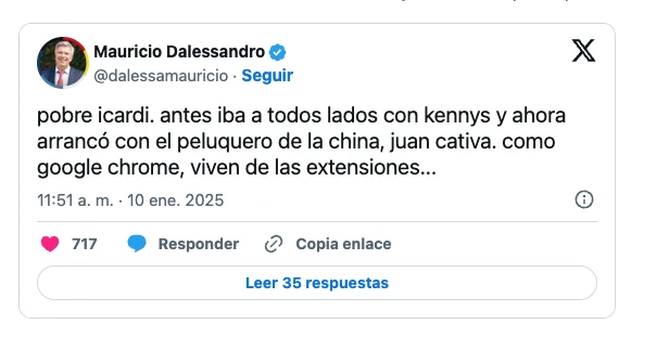 Ante esta situación, con tono de malicia, Mauricio D'Alessandro comparó en tono de broma: “Pobre Icardi. Antes iba a todos lados con Kennys y ahora arrancó con el peluquero de la China, Juan Cativa. como Google chrome, viven de las extensiones”.