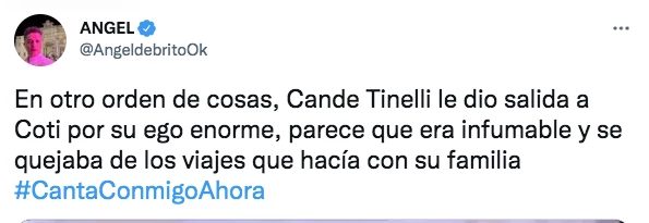 En su explosiva cuenta de Twitter, donde vuelca una parte de los datos que le llegan prácticamente "minuto a minuto", el popular Angelito manifestó sin dudar que "En otro orden de cosas, Cande Tinelli le dio salida a Coti por su ego enorme, parece que era infumable y se quejaba de los viajes que hacía con su familia".