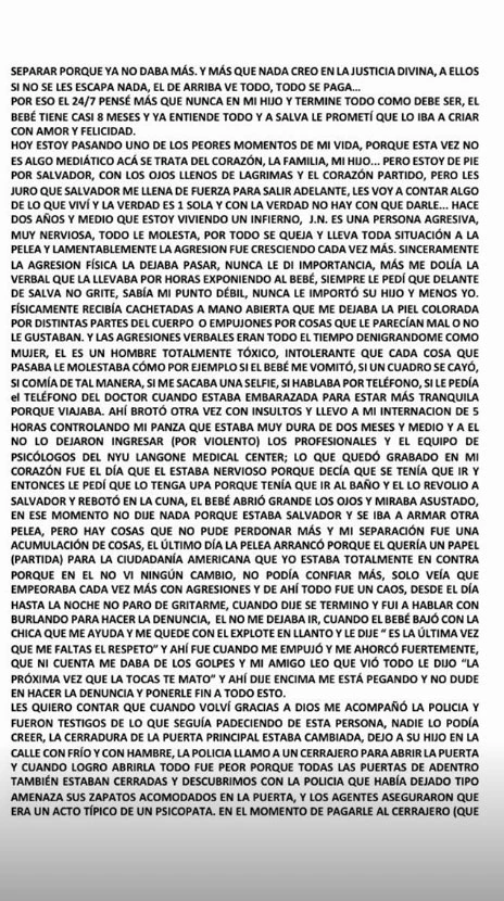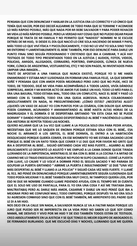 “Les habla mi corazón”, escribe la modelo a modo de introducción. Luego, se ocupa de desarmar los argumentos esgrimidos por el hombre a quien denunció en la Justicia por agresiones y maltrato.