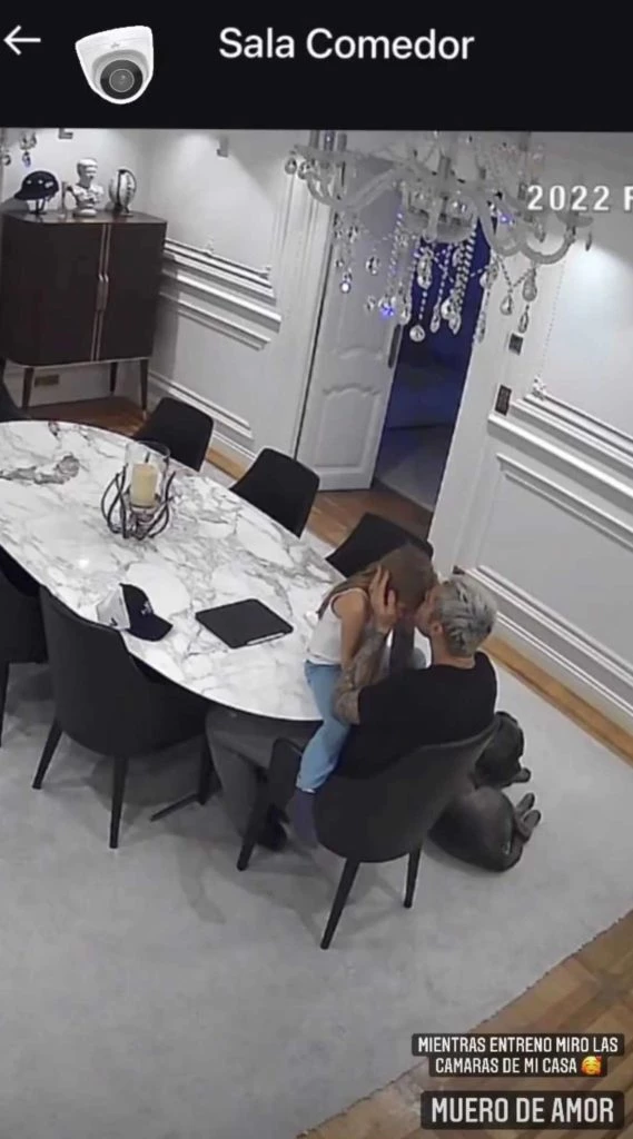 Wanda Nara en ese momento estaba entrenando y fiel al estilo Pampita vigila a su marido por las cámaras de seguridad que tienen en su casa en París. "Mientras entreno miro las cámaras de casa. Muero de amor", escribió la rubia junto a la postal de su familia.