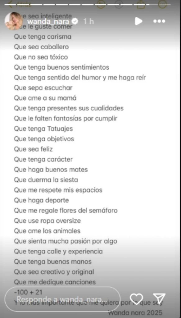 En la imagen que subió a Instagram, se puede observar que hay 29 requisitos para que Wanda considere al hombre que la quiere conquistar. Algunos son bastante esperables, pero otros extraños que van desde “ser inteligente”, hasta “hacer buenos mates”, que “duerma la siesta” y “que tenga buenas manos”.