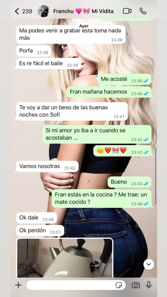 En medio de la polémica que se instaló en las redes y los medios, donde la acusan de “abandonar” a sus hijas con cada viaje al exterior que realiza (las niñas no pueden salir del país por restricción judicial), la mediática mostró cómo se lleva con ellas y el vínculo que las une. Todo quedó en evidencia por un chat que tuvo con la mayor de las niñas.