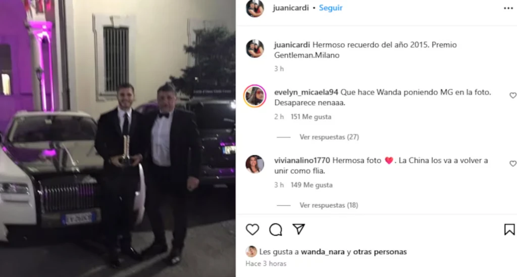 ¿Qué hizo Wanda? Le dio “Me gusta” a una foto que posteó Juan Icardi, su ex suegro y abuelo de sus hijas. Una publicación del hombre donde aparece Mauro Icardi vestido de gala, sosteniendo un premio. “Hermoso recuerdo del año 2015. Premio Gentleman. Milano”, escribió el padre del futbolista.