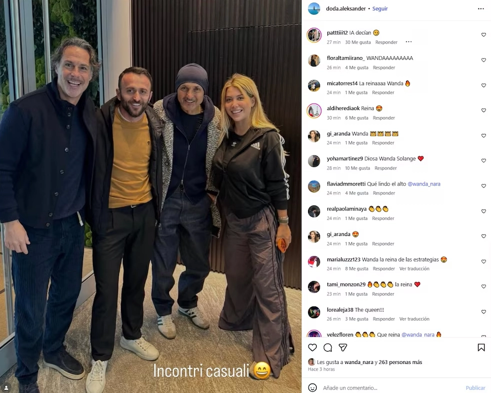 “Sobre las cartas, la mesa”, habrá pensado la rubia al tirar toda la carne al asador y compartir una publicación más donde se la ve en grupo con Spalletti y otras personas. Un posteo subido por Aleks Doda donde Wan aparece en escena con su iPhone 17 con carcasa naranja. Así, la mediática dejó en claro que ella no mintió. “Encuentros casuales”, se lee en la publicación, a lo que Wan sumó: “Amigos y vecinos de Italia”.