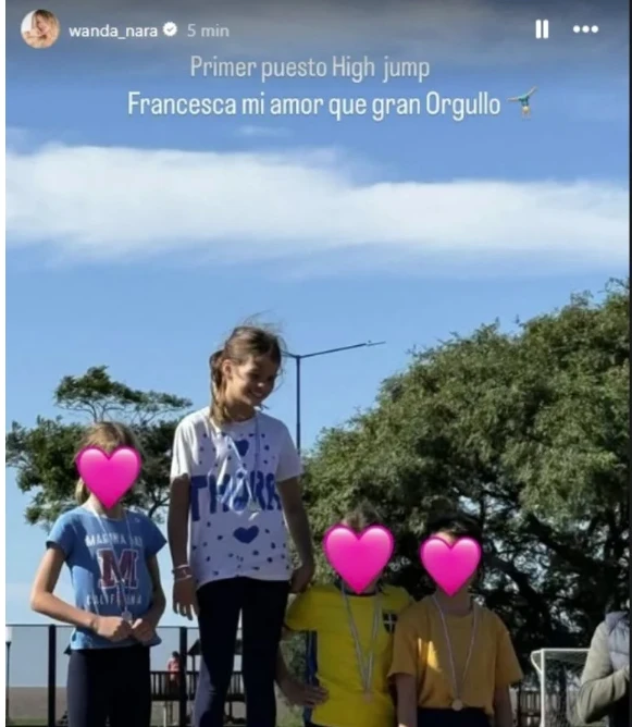 Con la emoción de madre, Wanda escribió: “Primer puesto high jump”. Más allá de utilizar términos en inglés para un deporte muy practicado en la currícula escolar de nuestro país, la fotografía muestra a la niña con una sonrisa a flor de piel en su rostro.