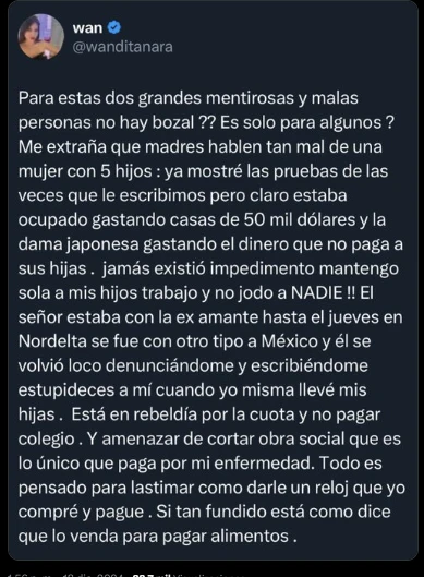 En cuanto a su deseo de contestarle a la información que vertieron en el ciclo de Telefe, Wanda exclamó: "¿Para estas dos grandes mentirosas y malas personas no hay bozal? ¿Es sólo para algunos? Me extraña que madres hablen tan mal de una mujer con cinco hijos".