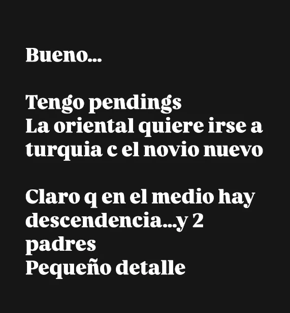 Y también se conoció el pensamiento, la postura de Nicolás Cabré sobre la mudanza de Rufina: “El otro progenitor no quiere saber nada con que la hija se vaya a Turquía, entonces la oriental, muy suelta de cuerpo, le dijo: '15 días con cada uno, y yo voy y vengo'. Total Mauri también paga las idas y vueltas".