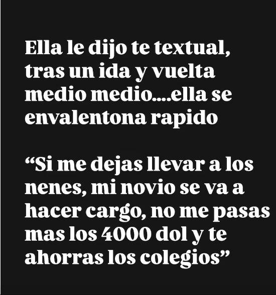 Respecto a esa charla privada de la China y el actor chileno, Latorre añadió: “Ella le dijo textual, tras un ida y vuelta, ella se envalentona rápido: 'Si me dejás llevar a los nenes, mi novio se va a hacer cargo, no me pasás más los USD 4000 y te ahorrás los colegios'”.