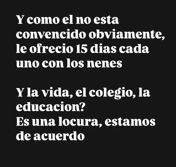 Claro que tamaño viraje de cotidianidad y con las complejidades de articular familias ensambladas implica un estudio pormenorizado. Por eso, la angelita explicó la reacción de Vicuña: "Y como él no está convencido, obviamente, lella e ofreció 15 días cada uno con los nenes. ¿Y la vida? ¿Y el colegio, la educación?. Es una locura, estamos de acuerdo".