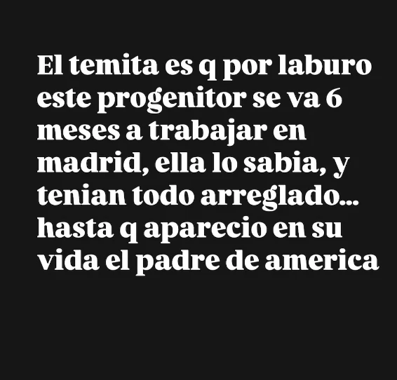 El trasandino afronta una dificultad mayúscula para diseñar toda esta logística que pretende resolver intempestivamente la China. Eso afirmó Yanina: “El tema es que por laburo el progenitor se va seis meses a trabajar a Madrid. Ella lo sabía y tenían todo arreglado, hasta que apareció en su vida el padre de América".