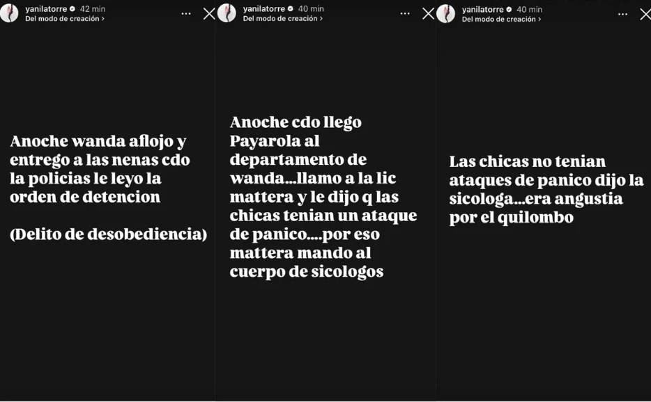 Según relató la conductora de SQP, la decisión de Wanda de entregar a las nenas no fue voluntaria, sino el resultado de una fuerte advertencia legal. “Anoche Wanda aflojó y entregó a las nenas cuando la policía le leyó la orden de detención”, comenzó escribiendo en sus historias de Instagram, dando detalles de lo que pasó tras el viernes de caos.