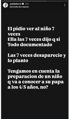 La ex angelita agarró su celular y escribió una montaña de stories para explicar todo este escándalo. “Dice que no lo conoce a su hijo porque su ex no lo deja. Eso es mentira. Hay pruebas. Las veces que pactaron encuentros él plantó al nene. Un chiquito ilusionado”, contó respecto al rol de Martín como padre.
