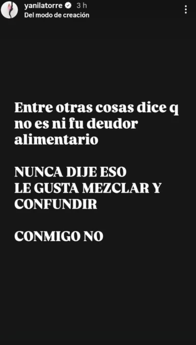 “Entre otras cosas dice que no es, ni fue deudor alimentario. NUNCA dije eso. Le gusta mezclar y confundir. Conmigo, no”, aclaró Yanina. Y agregó: “Dije que siempre pagó una miseria, pero siempre pagó la cuota. El tema es que el juicio de alimentos que perdió tiene que pagar el retroactivo, que no lo convierte en deudor alimentario, y dice que no tiene plata”.