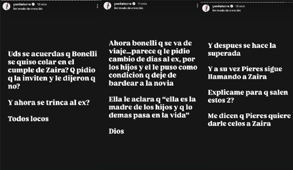 Yanina continuó con la data a la que accedió y narró: "Allá vamos… lo de Chechu Bonelli… se puso hermoso". Y así confirmó el eje de toda esta polémica: "Parece que ni Chechu ni Pieres soltaron a sus ex". Así como describió una entramado espinoso: "Ella sigue enloqueciendo a Cvitnich".