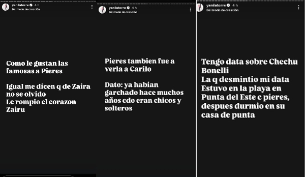 A partir de lo informado por Yanina, el polista no soltaría a la hermana de Wanda Nara y continuaría con una batería de mensajes privados para intentar reconquistarla. Latorre encendió la cerilla de una bomba y publicó: "Como le gustan las famosas a Pieres. Dato ya habían garchado con Chechu hace muchos años cuando eran chicos y solteros".