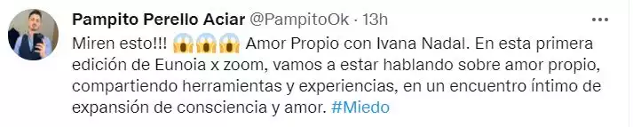 Por supuesto, las repercusiones después del anuncio no se hicieron esperar. Como el comentario de Pampito Perello Aciar, que exclamó en Twitter: “¡Miren esto! Amor Propio con Ivana Nadal. #Miedo”.
