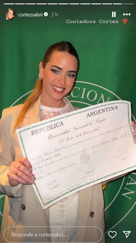 Después apareció en una foto sola con el diploma en abierto y con una sonrisa de oreja a oreja: "Contadora Cortez" decía el texto junto a un corazón. Pese a haber ganado fama por Gran Hermano, Sabrina siguió con sus estudios y terminó su carrera.