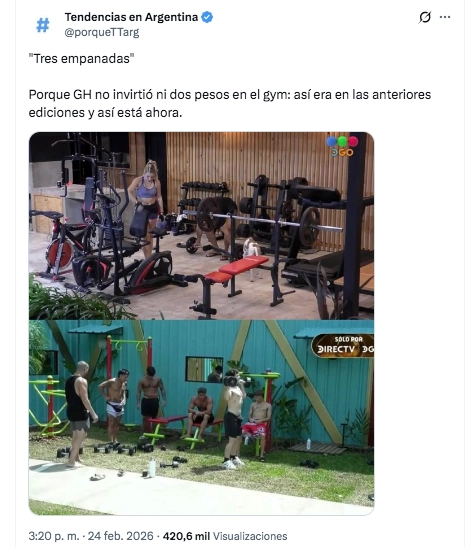 Esa frase en alusión a la icónica frase de Esperando la carroza, que significaba como ‘pobreza’. Así la red social añadió como descripción: “Porque GH no invirtió ni dos pesos en el gym: así era en las anteriores ediciones y así está ahora”. Lo que fue acompañado por una foto comparativa de los implementos de la camada de Santiago Algorta.