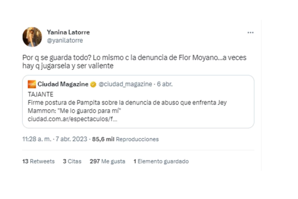 Luego de la nota, Yanina Latorre una de las panelistas más picantes que tiene el programa LAM, conducido por Ángel De Brito publicó en Twitter una critica hacia la modelo: "Por qué se guarda todo? Lo mismo con la denuncia de Flor Moyano... a veces hay que jugársela y ser valiente", afirmó la panelista que está auspiciando de conductora del programa por las vacaciones de De Brito.