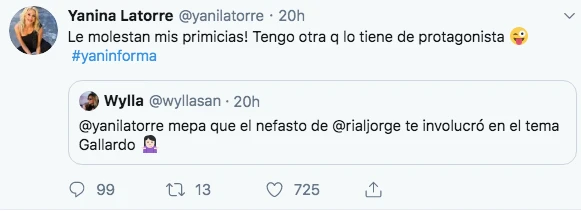 Lejos de quedarse callada, Yanina se despachó y apuntó contra Rial en Twitter. Una usuaria de la red social le sacó el tema y la rubia respondió: “¡Le molestan mis primicias! Tengo otra que lo tiene de protagonista".