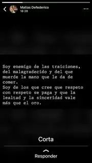 Antes de que se conozca cuál era la sanción que iba a recibir Matías, el jugador publicó un enigmático estado de WhatsApp: "Soy enemigo de las traiciones, del malagradecido y del que muerde la mano que le da de comer. Soy de los que cree que respeto con respeto se paga y que la lealtad y la sinceridad vale más que el oro. Corta". Si bien no especifica a quién va dirigido, todo hace pensar que la destinataria es su ex, Cinthia Fernández.