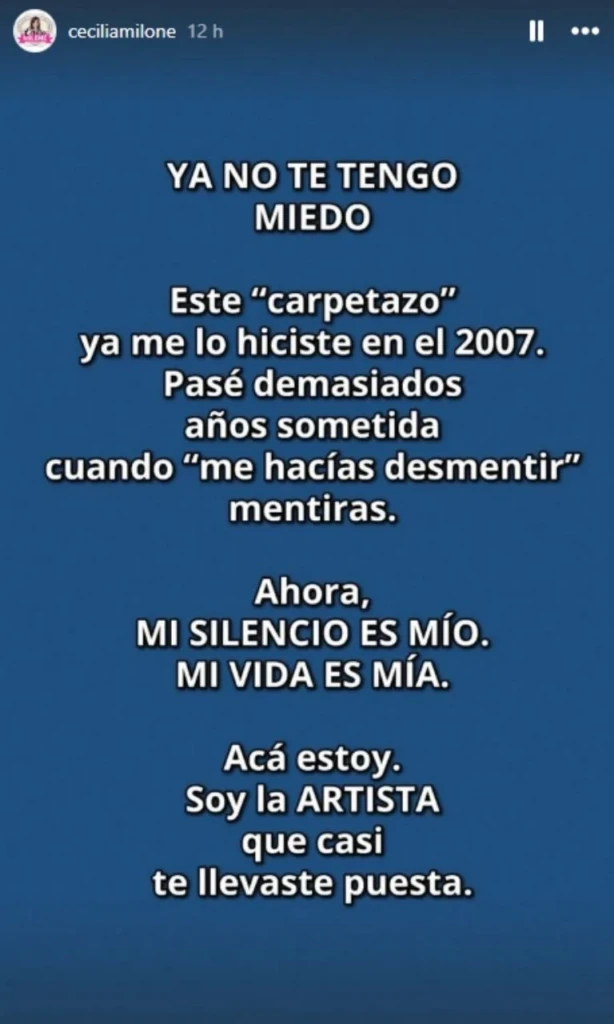 Los rumores indican que la destinataria de la denuncia sería su expareja, Nito Artaza. "Pasé demasiados años sometida cuando me hacías desmentir mentiras. Ahora mi silencio es mío. Mi vida es mía", escribió Milone, dejando claro que su etapa de callar se terminó. Muchos recordaron el 2007, cuando surgieron versiones de que tenía una relación con Artaza, quien en ese entonces estaba casado con Cecilia Oviedo.
