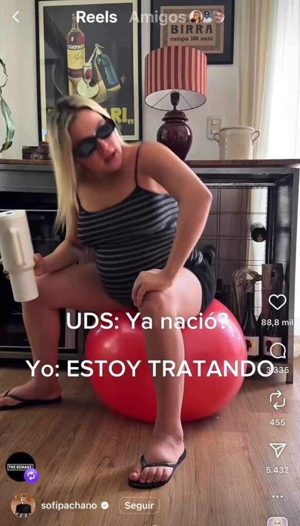 Es que ante la recurrente pregunta de sus seguidores, pero también de sus seguidores, pretendiendo saber si ya dio a luz, Sofía reaccionó con un breve reel que subió a su perfil de Instagram. Allí se la ve, con lentes de sol, saltando sobre una pelota conocida como medicine ball.