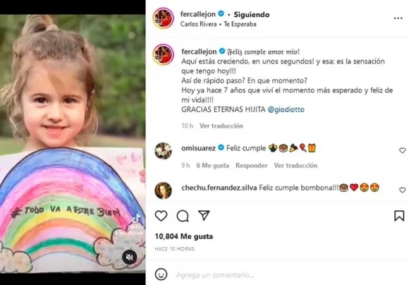 Más allá del pésimo momento que están pasando como ex matrimonio, María Fernanda Callejón le dedicó un video a su hija, que junto al mismo escribió: "Feliz cumple, amor mío. Aquí estás creciendo, en unos segundos. Y esa es la sensación que tengo hoy. ¿Así de rápido pasó? ¿En qué momento? Hoy ya hace 7 años que viví el momento más esperado y feliz de mi vida. Gracias eternas hijita”.