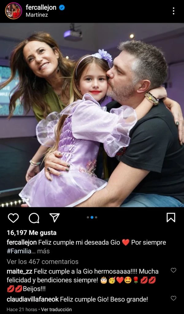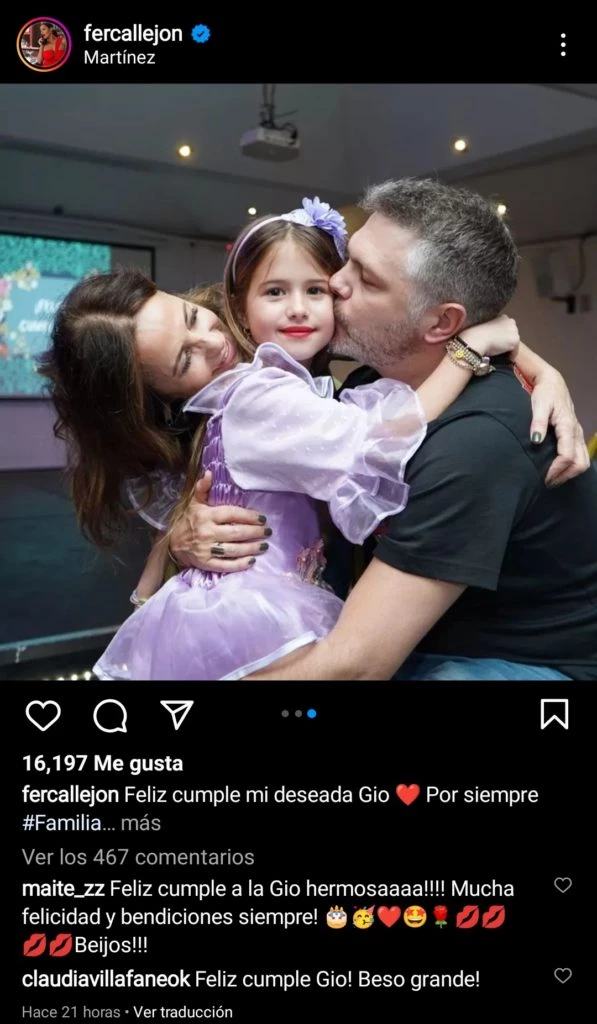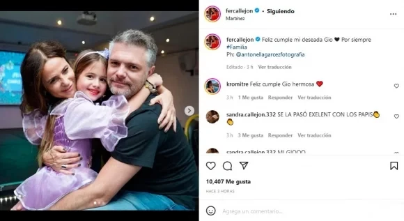 Eso no fue todo por el lado de María Fernanda Callejón, ya que en otro posteo compartió una serie de fotografías en donde sale ella con su hija y su ex esposo, que además dejó un mensaje en busca de unidad con el artista: “Feliz cumple mi deseada Gio. Por siempre familia”.